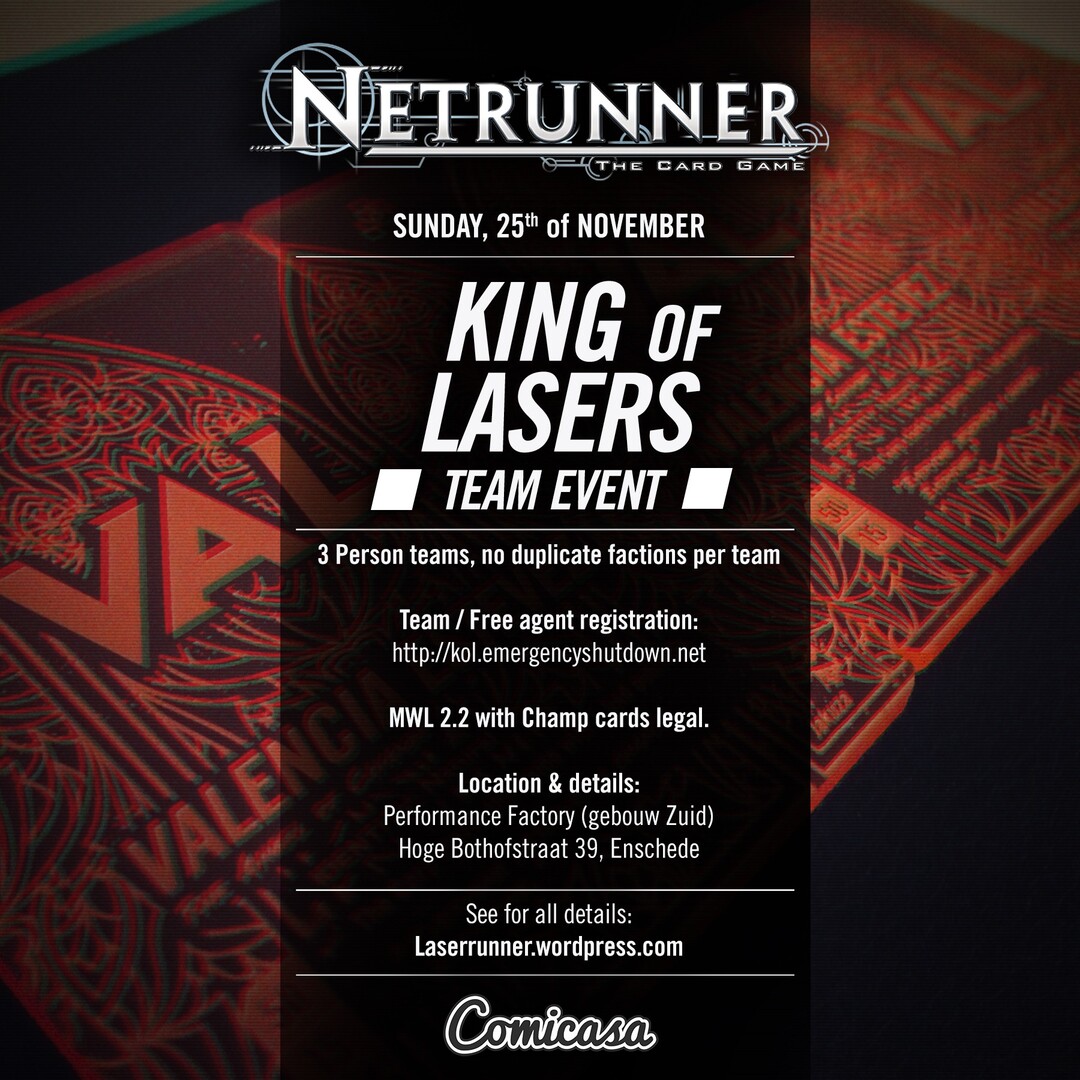 All Netrunners are warmly invited to take part in a special and likely one time event on the 24th & 25th of November: The LaserRunner weekend, including King of Lasers. This will be a truly unique event, with the usual server hacking and agenda stealing fun, but more uniquely: