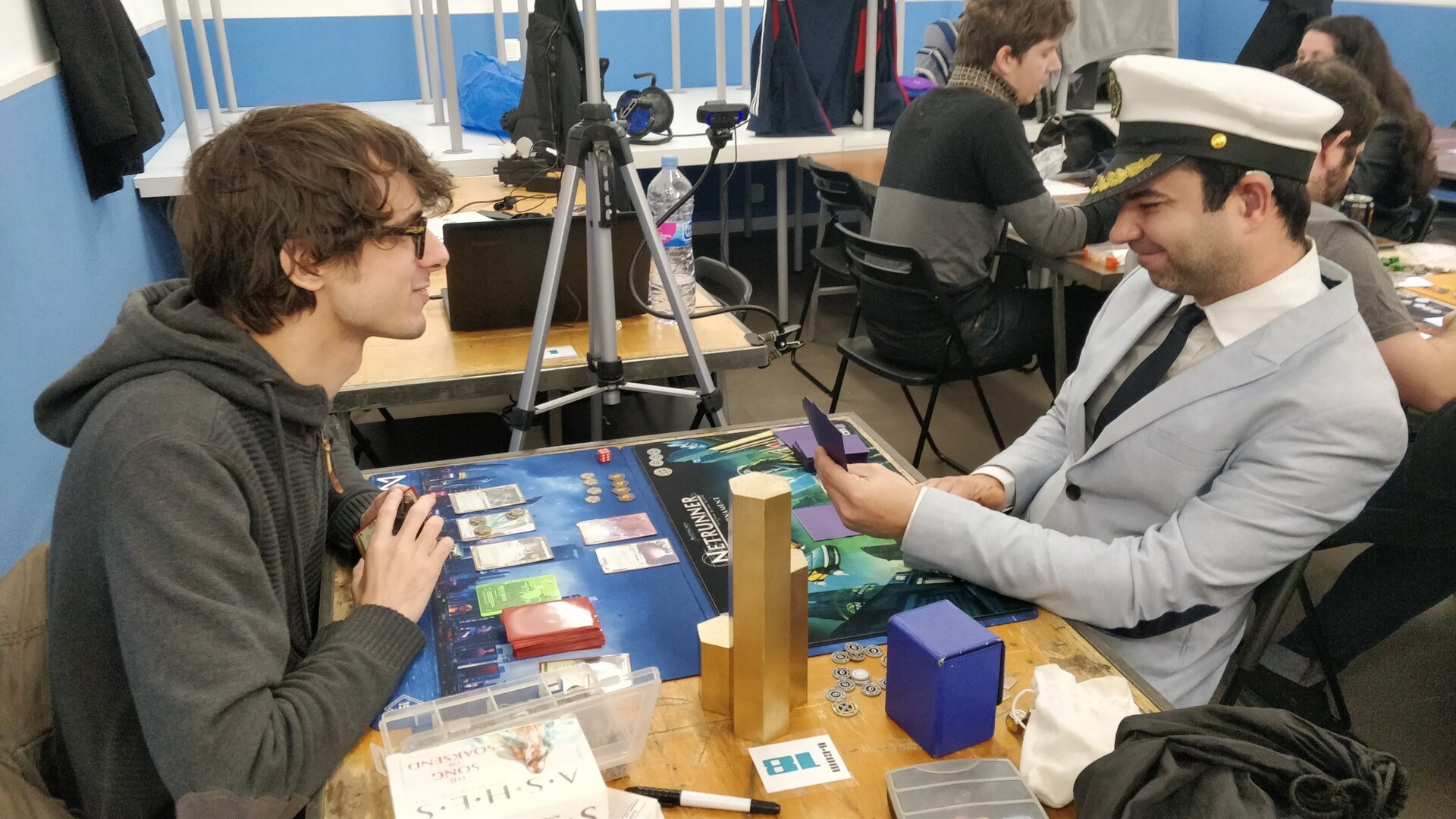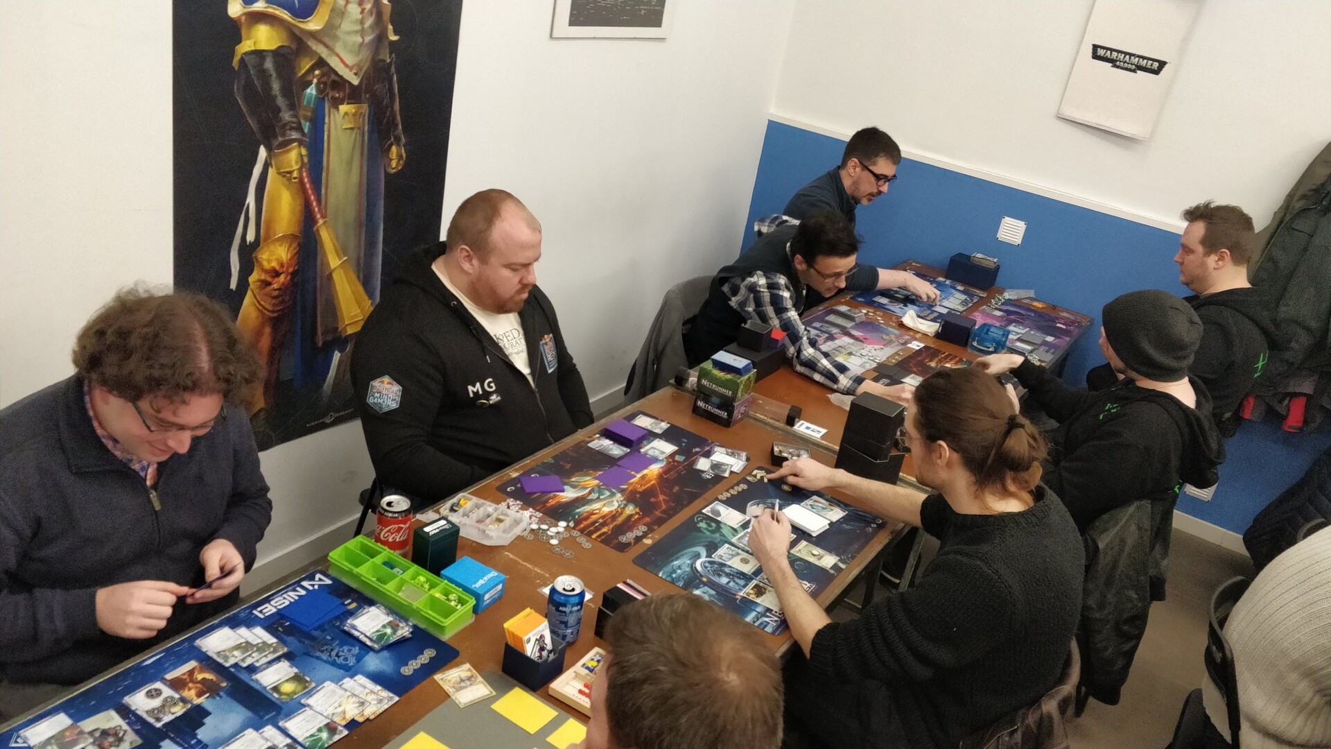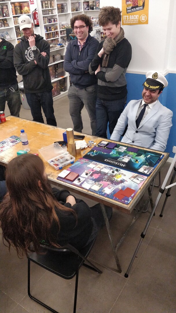 On offer: Android (up to 5 players), New Angeles (up to 6 players), Android: Mainframe (up to 4 players), 2 Tags & A Boom! (up to 30 players), Android: Love Letter (up to 4 players), and Hive:Android:Netrunner (world premiere of this 2 player retheme of Hive) (...if someone can bring Android: Infiltration, that would be lovely)