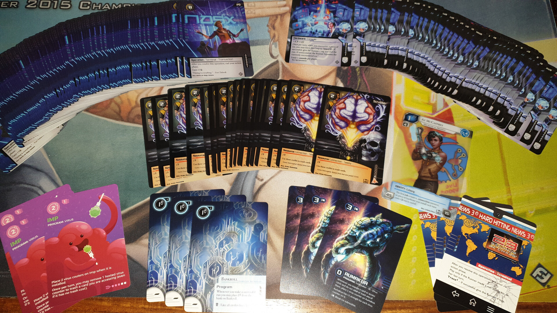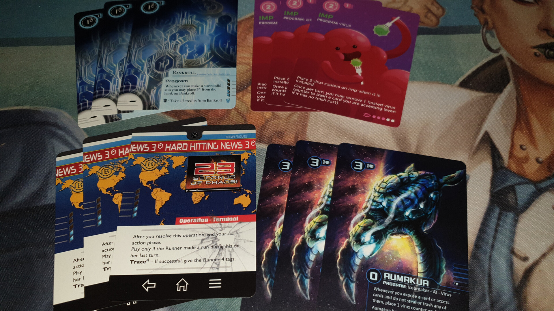Top four (one set each, higher finisher chooses first): 3x alt-art Aumakua (by Cat Shen), 3x alt-art Imp (by Alexis Spicer), 3x alt-art Bankroll, 3x alt-art Hard-Hitting News (both by Krembler)