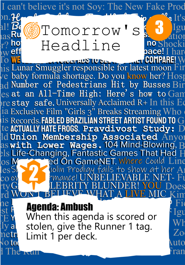 Logistics: We will be using this link for aesops for registration, and #online-tournaments-3 on the Netrunner Event Hub Discord: