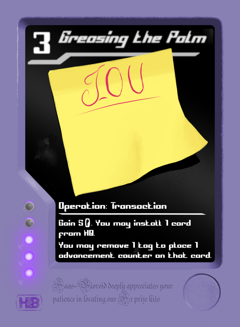 Prizing will be standard H224 Prizing as well as additional prizing from the LONDON PRIZE VAULT. **Please note that unfortunately the H2 Prize Kits will not be with us by the time of the event, and we have arranged replacement prize promos by kysra and brindelmold, as well as special prizing in the form of one-time "IOU" Alt-Art "Greasing the Palm" Promos! (Artwork by Ams - see below) **
