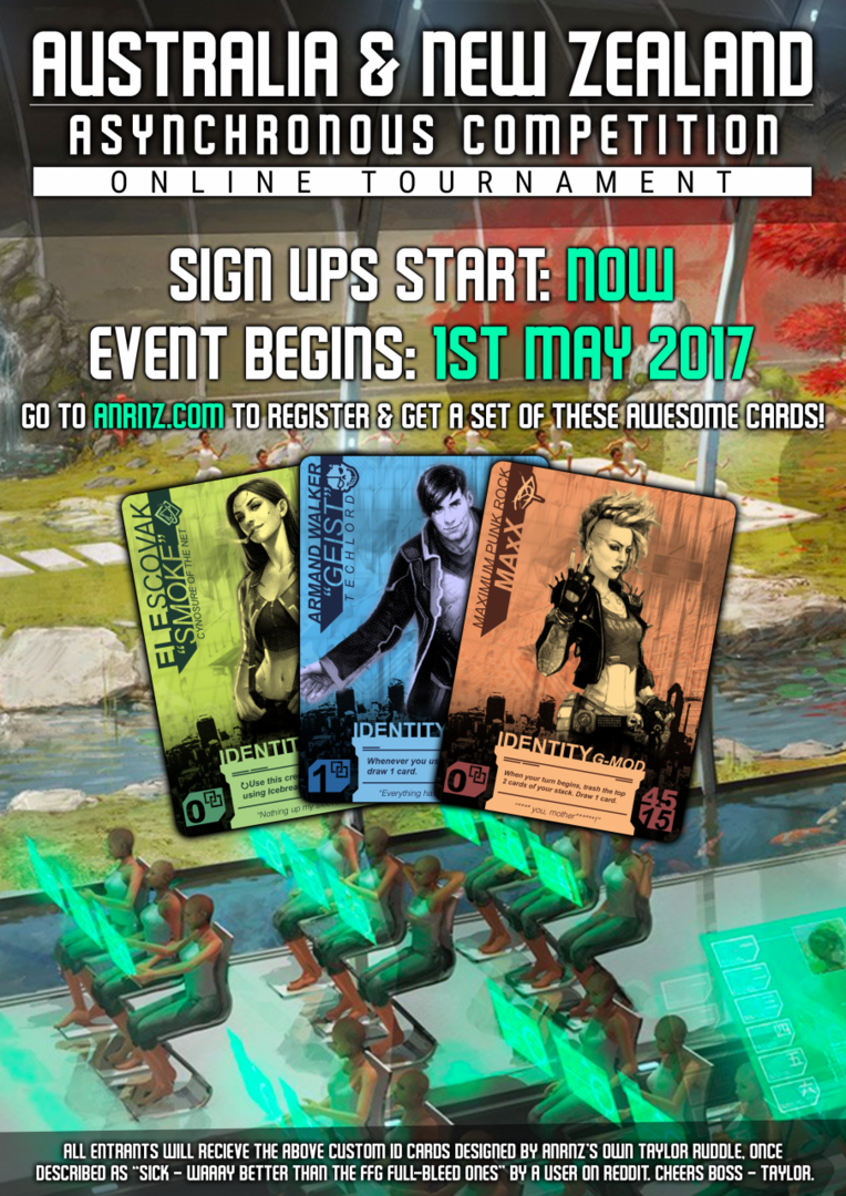 The Australia and New Zealand Asynchronous Competition is an online tournament that will begin on May 1st, wherein Kiwi and Aussie Netrunners will battle it out on Jinteki.net for the top spot. Terrific prizes are up for grabs, with all participants (irrespective of placing) snagging a set of beautiful custom art Runner identities, courtesy of the remarkably talented Taylor Ruddle.